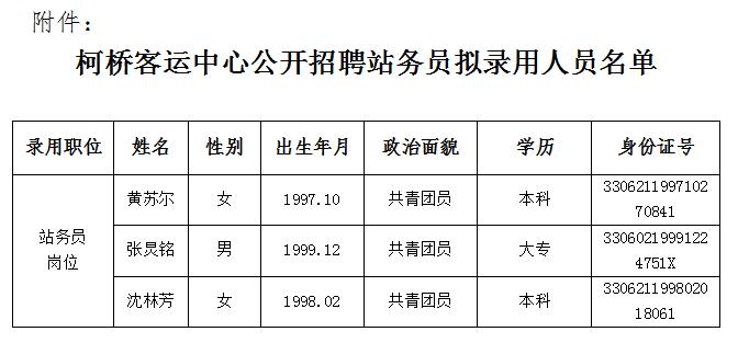 紹興柯橋客運中心有限公司因工作需要,經(jīng)國資辦批準面向社會公開招聘基層類崗位站務(wù)員3人,通過筆試、面試、素質(zhì)考察、體檢、政審考察等程序后,擬錄用黃蘇爾等3位同志?,F(xiàn)予以公示,并就有關(guān)事項通告如下: