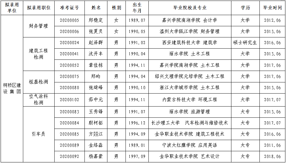 紹興市柯橋區(qū)建設集團有限公司擬錄用人員公示